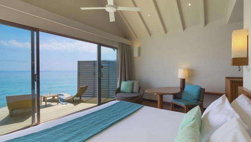 Wake to stunning views of the Indian Ocean for an early morning swim in paradise. The Deluxe Overwater Villa is set above the lagoon with steps leading down to the crystal clear waters. The romantic villa boasts 42 square metres of living space with either a king-size bed or twin beds, and a bathroom with shower.